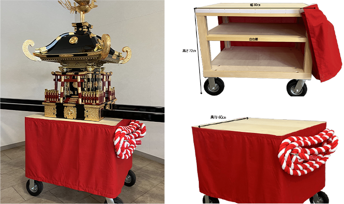 | 寸法 | 総幅:77㎝ 台幅:49㎝ 総丈(鳳凰上):107㎝ 担ぎ棒長さ:300㎝ 本体重量:29㎏ ※担ぎ棒・紐・鈴なし 飾り付けを含む総重量:約39.9㎏ |
